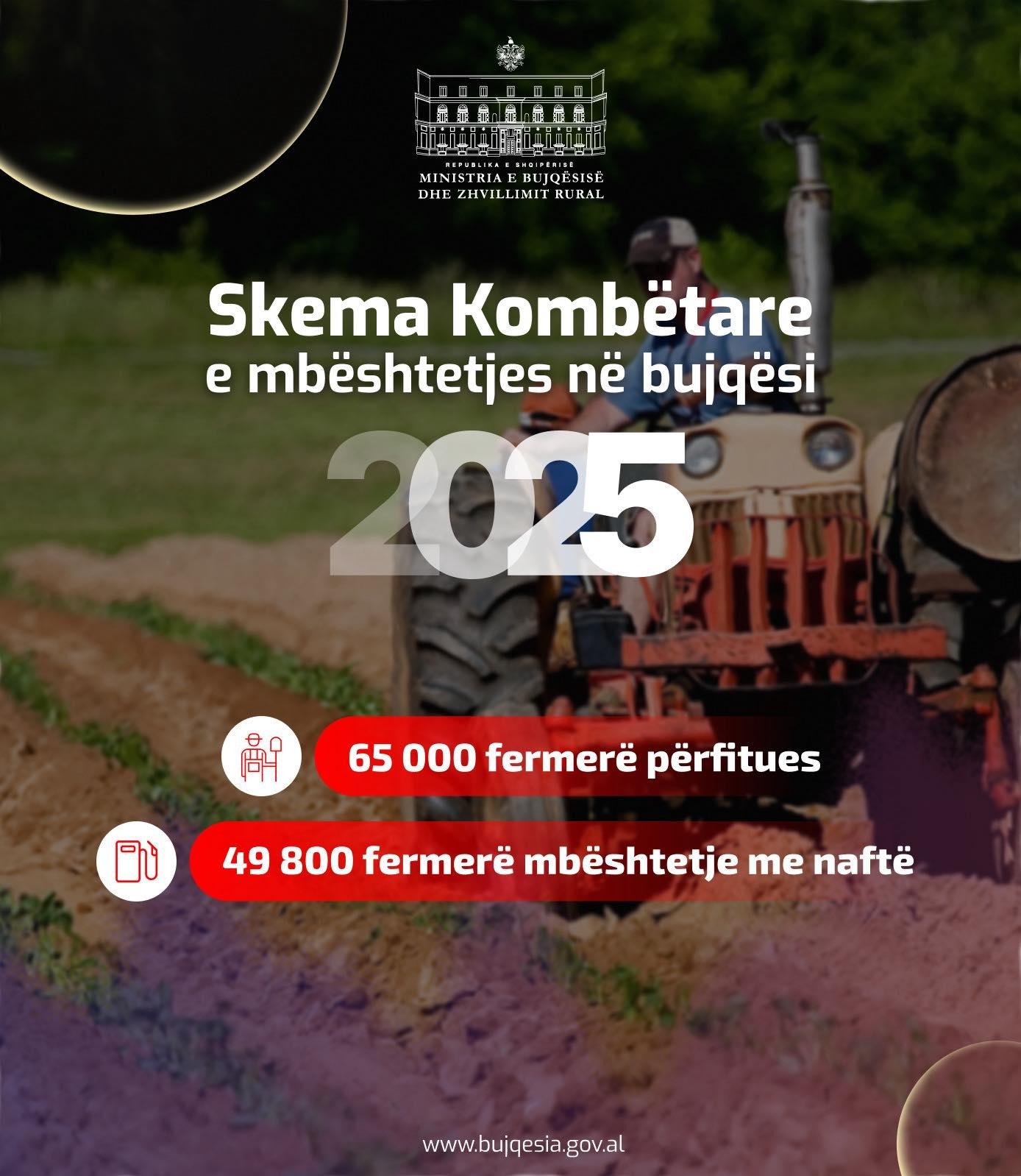 Të dhënat e vitit të kaluar tregojnë qartë peshën që kishte mbështetja për naftën në bujqësi. Në vitin 2025, rreth 65 mijë fermerë përfituan nga Skema Kombëtare, ndërsa 50 mijë prej tyre u mbështetën konkretisht me naftë falas.