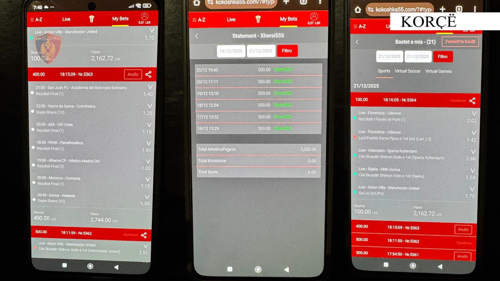 Shërbimet e Komisariatit të Policisë Korçë referuan materialet në Prokurori, ku nisi procedimi penal për shtetasit V. P., J. T. dhe R. G., banues në Korçë dhe në fshatin Drenovë, Korçë, pasi gjatë kontrollit të celularëve të tyre, në ambientet e lokaleve ku ndodheshin, u konstatuan faqe për baste sportive.